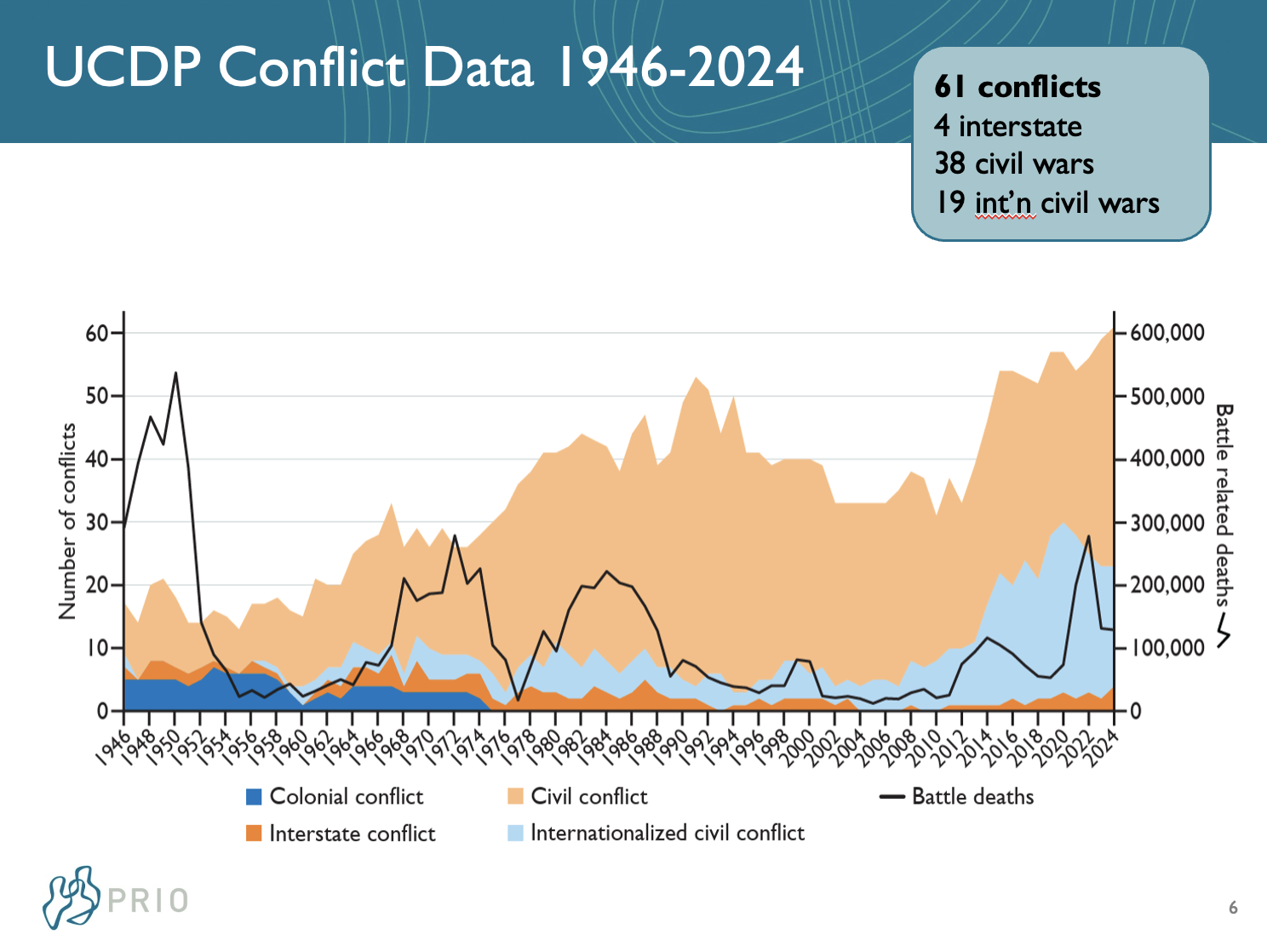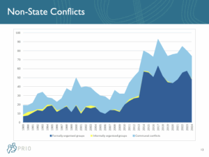 From the end of the Cold War up to 2013 there was a decline (except in Iraq), while today we have local conflicts in 16 countries that involve some group directly or loosely affiliated to ISIS which Aas Rustad called a new level of group franchise.